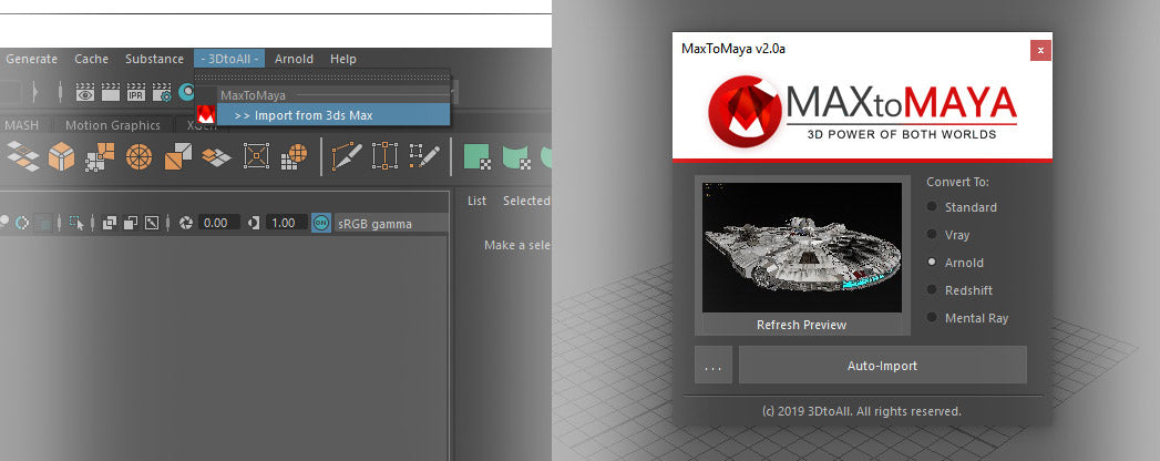 MaxToMaya 2024 von 3DtoAll ist ein bahnbrechendes Plugin, das die Übertragung von Szenen und Modellen von 3ds Max zu Maya revolutioniert. Mit nur zwei Klicks können Sie Ihre 3D-Projekte nahtlos zwischen diesen beiden mächtigen Softwareplattformen austauschen. Dieses Plugin ist für alle 3D-Künstler gedacht, die ihre Arbeitsabläufe optimieren und die besten Werkzeuge beider Welten nutzen möchten.